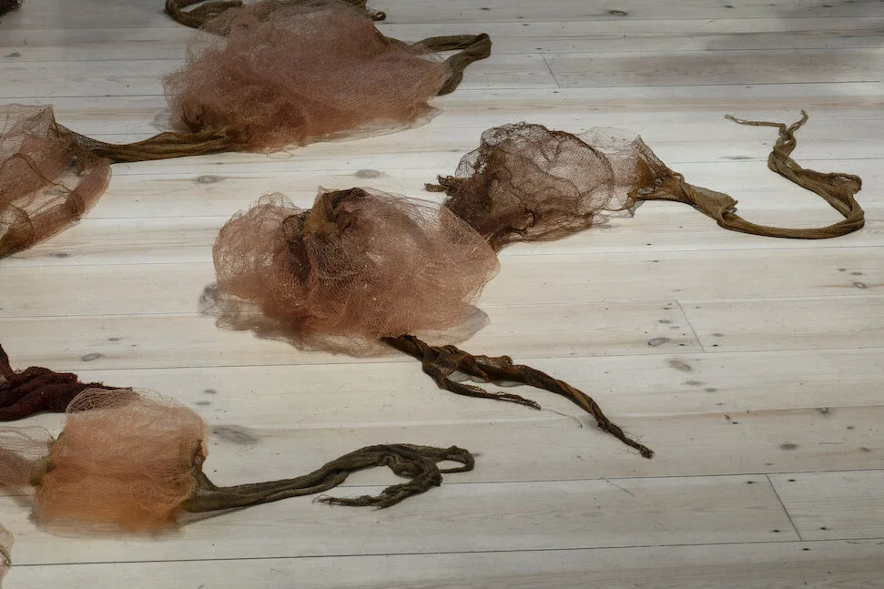 The sculptural objects are made of discarded and damaged pieces of knit together with perfectly knitted pieces. They are recreating holes in the knit itself, and as holes of what was not, what never became and never will become.