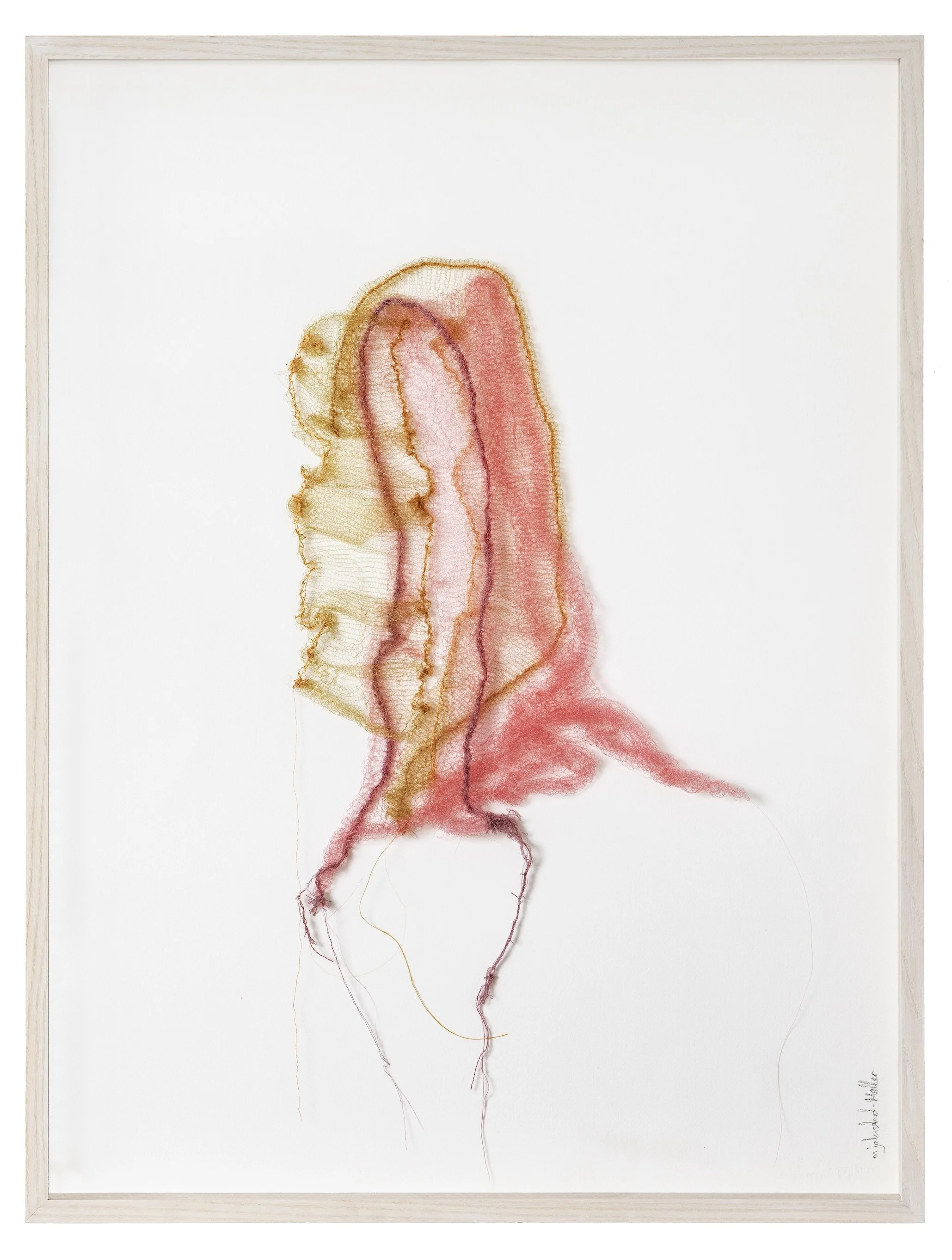 They are part of an exploration of the possible traces we make on each other through our lives together and how those traces affect our personality. I also experiment with the many variations possible in the mix of yarn, lace, paper and textile.